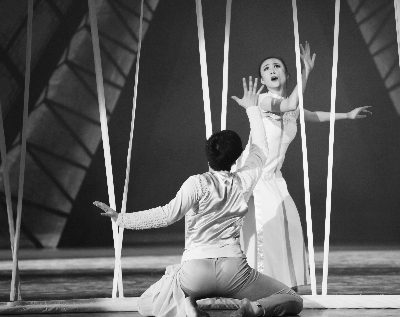《秀》剧的表达,同样标榜了舞剧思维的优长。首先,赵明导演擅长的芭蕾舞语言方式和构词系统,不仅使《秀》剧的肢体感觉卓然炫彩,而且使舞蹈和舞者的舞剧状态顺畅不羁,实践了编创者的审美诉求——用舞蹈表现戏剧人生。其次,《秀》剧简约、直陈、抒情性的表述风格,赋予舞蹈较大空间,让本体和舞段的独立表意尽可能地实现,既有充分的“舞性”,又有适度的叙事和纵深的情感,凸现了本体的艺术魅力。音乐的细腻、丰满、性格化和交响的多意性,完满表达了舞剧音乐的造型张力,无疑是近来该领域一部标志性的作品。舞美的整体大气与空间的运动灵气,作为创作核心环节的主体意识伸张,连续不断地动作变换,都为整体的完型建构奉献了力量。