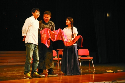 近日,中国戏曲学院导演系影视表演专业与深圳公益文化品牌项目“剧汇星期天”在深圳市福田区开设了戏剧教学实验基地。图为观众在福田区石厦戏剧主题馆内表演话剧《暗恋桃花源》片段。 张 沐 摄