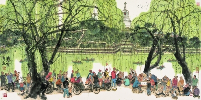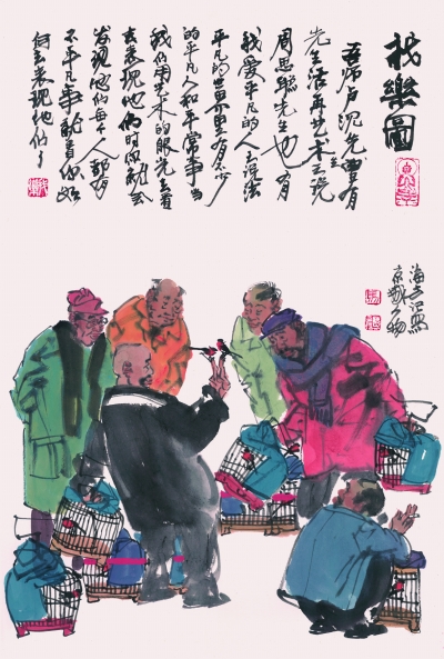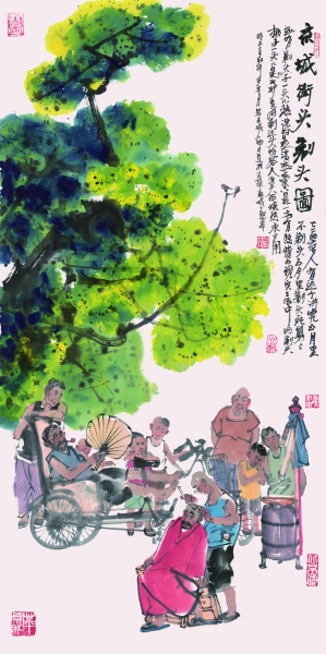 传统中国画向来是“重墨轻色”,一些文人画家在有意或无意之中往往把重彩与“俗气”和“匠气”相关联。但要表现丰富多彩的现实生活,仅仅以水墨为主的传统画法是远远不够的。特别是表现浓郁的民间风俗、热闹的集市庙会、节日的喜庆欢乐、民间的婚丧嫁娶的场景等等,如果没有鲜艳的色彩,就缺少那种特有的气氛与活力,而且脱不开前人画法的陈旧感。通过反复实践、不断摸索,我渐渐形成了水墨与重彩相结合的重彩没骨人物写意画法。色墨混融,设色时不仅仅孤立地用色,而是色当墨用,融墨于色,线条隐于色中而不失其骨,在人物的动态和形态方面进行提炼与夸张,重点刻画人物面部表情和手与脚的结构。衣饰则用石青、石绿、朱砂、大红,阔笔重彩,渐次形成色足墨饱、色墨结合的风格特征。但要在“没骨”中“见骨”,无线条而显示人物轮廓和内在结构,于色彩中见沉厚去淤滞,重彩而不见燥气。清代画家恽寿平以“没骨”写花鸟得神采,近现代画家石鲁、关良以“没骨”写人物得情趣,都是很好的范例。初学者应多看、多读、多做大量的速写或默写。只有具备准确的造型能力,才能张驰有度地于没骨中见有骨,摒弃匠气,于大俗中见大雅。