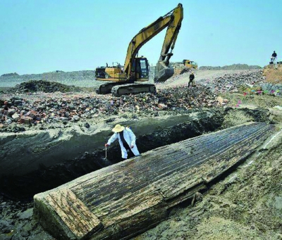 近日,天津市北运河北辰区张湾村段整治清淤改造工程施工中发现一处明代沉船遗址,这是天津考古史上首次发现与发掘大运河沉船。6月4日,保存最为完整,体长12.66米的2号沉船被整体吊装,移至河东区大直沽的元明清天妃宫遗址博物馆进行室内发掘整理。图为明代沉船遗址起吊现场。