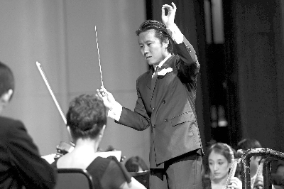 6月23日,第一届李德伦全国指挥比赛闭幕式暨颁奖音乐会在山东省青岛市人民会堂举行。图为颁奖音乐会上,获得该项比赛第二名的焦阳指挥乐队演奏德彪西作品《牧神午后》前奏曲。本报记者 卢 旭 摄