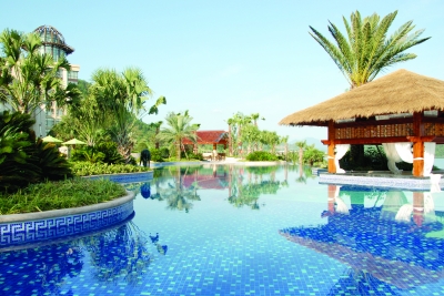 酒店的建筑带有新亚洲风格的痕迹,而清新的千岛湖、秀丽的山体和碧绿的湖畔让人仿佛到了海边。棕榈团队为此营造了独特的湖边酒店环境,在风格上运用简洁而略带热带风情的景观元素进行装饰。遍布酒店区域的热带植物、火焰图案装饰的泳池图案、随风飘逸的婚礼亭白纱、伫立游泳池边的茅草亭、临湖而建的瑜伽亭、精致的小品、雕塑、沙滩排球场等等,这些景观和谐相处,统一于新亚洲风格的设计情境,生动别致,趣意盎然。