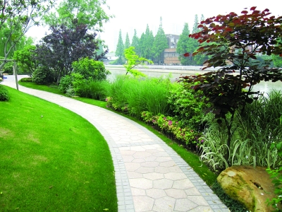 事件在人们心里造成的承重感,短期内难以消解。因此,如何最大化、最优化地整合好这片场地,全面提升景观质量、激发场地活力是一个务实的关键问题。景观营造者采取的措施是:首先将小区内原规划的全车行道系统进行人车分流的置换,将一部分非必要的沥青路进行景观化整改。对小区周围环境进行整合优化,将滨河区域一块很大面积的市政绿地进行协同设计,既方便于借景滨河景观,扩大绿化视域,同时也以一种担当的角色增强小区与周边环境的和谐,从区域的共融与交流上深厚地支撑这种稳定感。