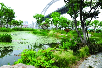 花境配置是一大亮点。根据因地制宜、适地适花的科学原则,将浮水植物、岸边停水植物到岸上陆生植物一体化统一布置。同时,木本与草本植物有机组合,乡土与外来植物合理配比,在自然生态风格的主导下,通过师法自然的造境手法,数百种园林植物科学巧妙地布置在2000多平方米的景区内。