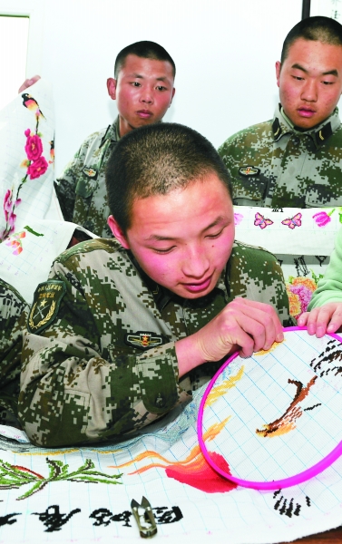 满怀着好奇,走近“绣房”,里面的景观真让人大开眼界:5名战士正拿着针线,照着画谱,一针一线地绣着行楷的“家”字。