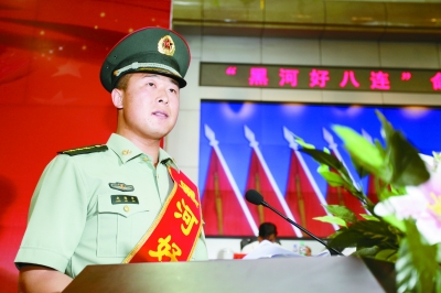 今年是中央军委授予黑龙江省军区65935部队八连“黑河好八连”荣誉称号15周年。6月20日, “黑河好八连”命名15周年纪念大会在边城黑河举行。黑龙江省军区政治部主任夏中国宣读贺信。省军区司令员盛斌号召各级部队积极开展向“黑河好八连”学习活动。图为八连指导员赵维军在大会上发言。
