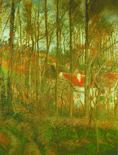 毕沙罗祖籍法国波尔多,出生在当时属于丹麦的圣·托马斯岛。父亲在岛上开百货店,生意红火,他希望儿子继承自己的事业,但毕沙罗却自幼对艺术表现出浓厚兴趣,并在巴黎上学时迷上了绘画,结识了画家柯罗、莫奈、塞尚、巴齐耶、雷诺阿和西斯莱等人。毕沙罗的绘画之路并非一帆风顺,1859年,他的作品入选沙龙,其后,则连续两次落选。就在那时,他因为和母亲的女仆相爱同居,家人因此不再给他资助。他的生活陷入了窘境,画又卖不出去,为了糊口,他甚至不得不去做油漆工。但贫穷没有击倒这位坚韧的画家,他在给一个朋友的信中说:“绘画使我快乐,它是我的生命,其他无关紧要。”