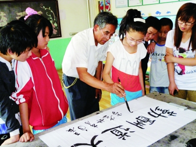 为弘扬中华传统文化,提高留守儿童的审美能力,日前,济南市东阿镇组织本镇、洪范池镇、泰安市旧县乡“两市三地”10余名书画家来到平阴县少岱小学留守儿童活动站,现场挥毫泼墨示范。图为中国书画家协会会员马文来指导留守儿童练习书法。