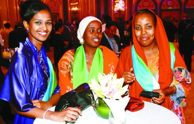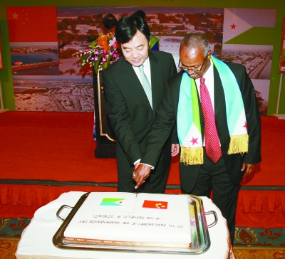7月2日,吉布提共和国驻华使馆在北京举办吉布提共和国35周年国庆招待会,包括非洲多国驻华使节在内的中非嘉宾应邀出席。左图为中国外交部副部长翟隽与吉布提共和国驻华大使阿卜杜拉·米吉勒共切庆祝蛋糕;右图为招待会上盛装出席的非洲嘉宾。