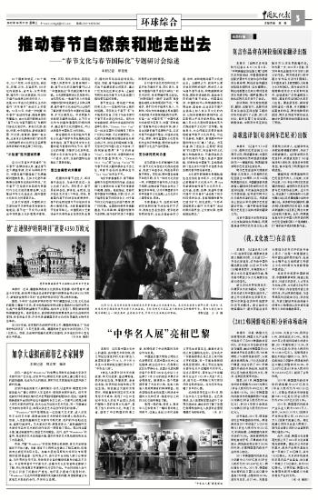 82个国家和地区,144个城市,323个项目,40多位总统、副总统、总理、议长、王室成员,500多位内阁部长、省市长、议员等政要,海内外1500余家媒体,约3000万海外主流民众和华侨华人……这是2012年由文化部牵头主办的海外“欢乐春节”活动交上的答卷。10月12日,为进一步挖掘“欢乐春节”活动的内涵,提高其国际传播能力,由文化部外联局主办的“春节文化与春节国际化”专题研讨会在北京召开。来自文化部、政协、侨联、中央电视台、新闻出版总署、外交部、教育部、国家广电总局、北京市文化局相关部门的负责人和民族民间文化研究及品牌营销等领域的专家出席了研讨会。