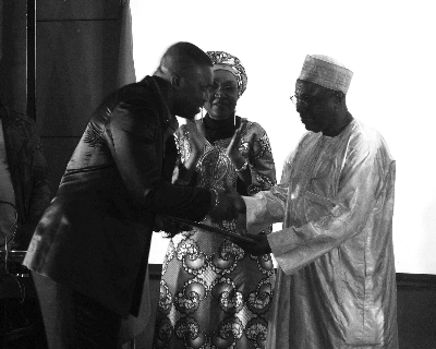 10月12日,尼日利亚驻华大使馆在北京举办独立日庆祝音乐会。尼日利亚驻华大使阿米努·巴希尔·瓦利及非洲多国驻华使节出席了庆祝活动。多位非洲艺术家表演了精彩纷呈的歌舞节目。图为大使夫妇为歌手郝歌(左一)颁发奖杯,表彰他为中尼、中非文化交流做出的贡献。本报记者 王 位 摄