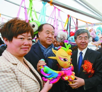 10月29日,第三届中国(高密)红高粱文化节在山东高密开幕,2012年诺贝尔文学奖得主莫言出席开幕式并获赠第十届中国艺术节吉祥物“凤舞东方”。图为山东省委宣传部副部长、省文化厅厅长、“十艺节”山东省筹委会常务副秘书长徐向红(右一)将凤舞东方赠与莫言(右二)。本报驻山东记者 常会学 苏 锐 摄影报道