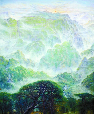 画家以中国山水画的散点透视法和西方绘画的空间表现形式来组织画面构图:既展现出西方绘画“平远”的纵深空间,又有中国山水画“高远”之巍峨壮观。整体营构,注重山势之完美体现;造化归一,尽显气韵之妙造无言。山峦峻峭不乏丰草幽卉,苍松高进依然玉树临风;云雾蒸腾正在舒卷如意,流水矫柔不忘穿石之志。作者用笔方圆无拘,坚柔合之成章法;色彩铺陈潇洒,一片傲然灵旷之风。