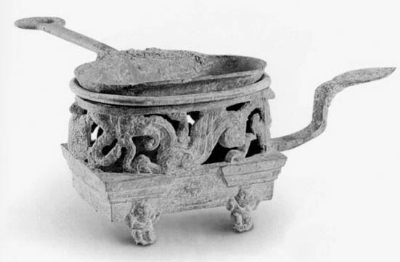 汉、晋时,达官贵人常用熏炉来焚香,这种炉又叫博山熏炉,具有熏香、除秽、熏衣、取暖的功能。汉代学者刘向曾在《香炉铭》中这样描述:“承以铜盘,中有兰绮,朱火青烟。”炉之所以称作炉,显然是因为有“朱火”,也就是“明火”。熏炉的形状很奇特,主要分为器盖、炉身和足三部分。炉的基座部分状如今日洋酒杯的杯足,盖上则装饰着连绵的仙山以及各种各样的奇花异兽,盖中还有孔,以便香气溢出。小型熏炉一般为日用器,主要用于熏香衣物,大型熏炉则为庙堂之物。