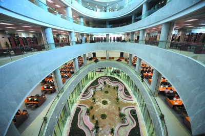 顺着大门口的楼梯,来到位于新馆二层的中央中庭。天光透过圆形屋顶倾泻而下,如同智慧之光醍醐灌顶。这一层总共有1.24万平方米,是图书馆的主要楼层,除了主入口两边的总服务台、总咨询台及分设两边的手扶电梯和步行阶梯,还设有信息发布系统和读者引导系统。在这一层,朋友们可以在中文报刊阅览区纵横,也可以在读者自修区咀嚼;还可以在24小时自助借还区享受。当然,如果觉得看书看累了,到150座的读者咖啡吧品品咖啡、尝尝茶香,也是不错的选择。