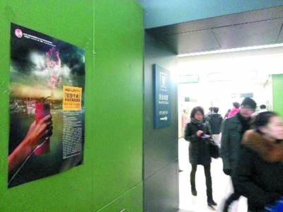 2月4日,北京地铁6号线青年路站的出站口张贴了北京市人民政府烟花爆竹安全管理工作领导小组办公室张贴的宣传海报,“‘怒放生命’不该是如此容颜”为主题的海报,以雾霾下的北京为背景,画面中间燃烧着的红色爆竹冒出的浓烟引人注目。(宋佳烜 文/图)