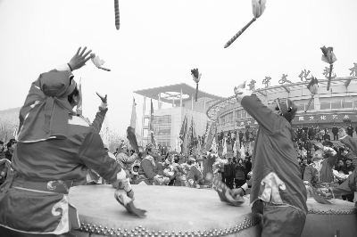 2月21日(正月十二)恰逢河北肃宁县城大集,一年一度的农民进城花鼓会文艺展演将肃宁县第二届农民文化艺术节推向高潮。各乡镇选送的36支农民文艺演出队、1500多名农民演员在县城文化艺术中心广场、人民公园等3处展演场地一展风采。肃宁县城旌旗飘扬,锣鼓喧天,彩绸飞舞,数万民众一起欣赏了这场文化盛宴。图为展演现场。杨进涛 摄