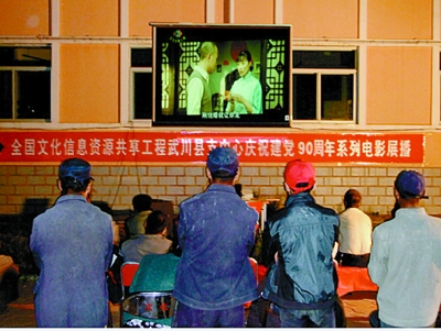 在广场为基层群众,特别是为农民工播放精彩的影视节目,是支中心服务工作的重要内容。在庆祝建党90周年、纪念辛亥革命100周年之际,武川县支中心在县文化广场举办了为期一周的“电影展播”活动。《解放大西南》、《女刺客》、《狮王争霸》……一部部情节扣人心弦的影片精彩纷呈,掌声、欢笑声、赞扬声不时地回荡在广场上空,成为夏日人们休闲娱乐的一道亮丽风景。放映活动也使大家对文化共享工程有了零距离的接触,一位来自四川的农民工对工作人员说:“这个活动太好了!这回我不用整晚都在寝室里望着天花板想家了!”