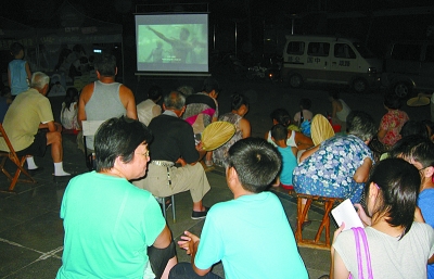 “今晚共享工程支中心要到社区来放电影”,南龙小区居民争相传递着这个信息。晚饭后,设备调试完毕,电影《建国大业》开始播放了。富有个性的人物和风云变幻的岁月,吸引着上百双入迷的眼睛。不一会儿,附近小区的数十名居民也围了过来,大家看得津津有味。“你们什么时候也来我们小区送电影啊?”家住邻近小区的李女士看完电影后说:“我们小区人多, 大伙儿也爱在露天活动,如果送电影过去,肯定受欢迎。” 男女老少围坐在露天银幕前,一幕幕引人入胜的场景,一片专注的眼神……老一辈人记忆中露天看电影的情景,又在南龙社区重现了。