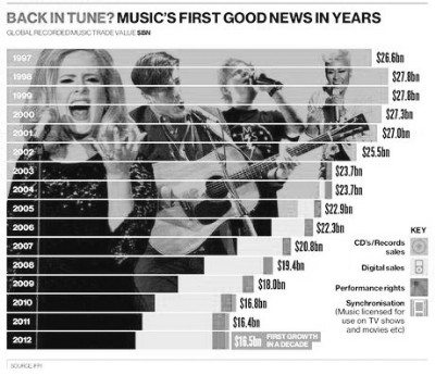 这是13年来首次呈上升趋势。自1999年以来,音乐产业持续萎靡,销售逐年下滑。音乐产业终于成功完成互联网革命,数字音乐的销售开始弥补传统唱片销售的大滑坡。业内人士指出,恢复增长是音乐产业转型带来的结果,虽然这一转型花费的时间有些长,但音乐产业现在已经适应了网络世界。