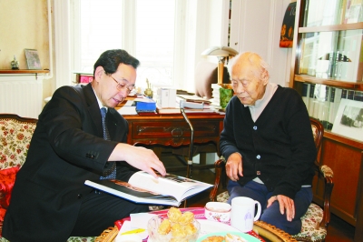 就在这时,李治华走进书房。虽然老人行动略有不便、听力略有障碍,但身体无恙,看上去精神矍铄、红光满面。吕军向李治华转达了中国驻法国大使孔泉的问候,也表达了自己时隔30年后与李先生再次见面的喜悦之情。30年前,吕军在使馆文化处工作时,时任文化参赞肖特时常与李治华会面。直到现在,肖特依然很惦记李治华,嘱咐吕军代他看望。
