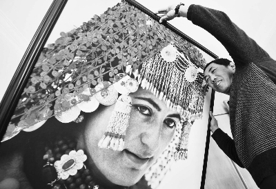 图为王承旺在展示他拍摄的少数民族题材的摄影作品。