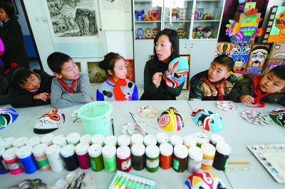 3月26日,山东省烟台市潇翔小学举行主题为“绘戏剧脸谱,赏国粹精华”的课外创作活动。学生们在老师的指导下绘制戏剧脸谱,感受传统文化魅力,迎接3月27日“世界戏剧日”。图为烟台市潇翔小学的老师在指导学生绘制戏剧脸谱。新华社发(初 阳 摄)
