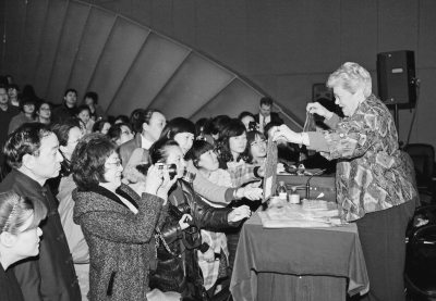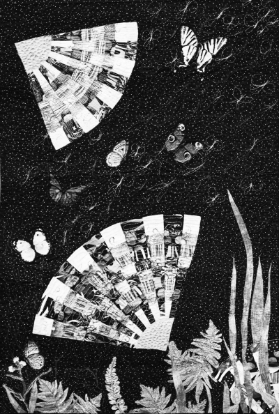 展览现场,来自美国的拼布艺术家Martha Ginn女士与观众互动。左图为她捐赠给大连现代博物馆的作品《蝴蝶飞过》。李 慧 摄