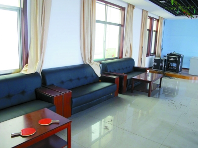 在文化活动室里面,几张沙发、桌子、三两副乒乓球拍和一个影像设备便是该文化活动室的全部设施。活动室内的桌子、沙发上布满灰尘,地上还有不知什么时候撇下的烟头。