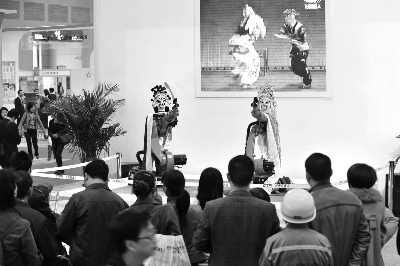 3月28日,由重庆市人民政府、中国有色金属工业协会共同主办的第十三届中国金属冶金展在重庆国际博览中心正式开展。为期3天的展会,吸引国内外参展商972家,包括ABB、西门子、安捷伦、库卡、巴顿菲尔等160余家来自美国、德国、法国、英国、瑞典等25个国家和地区的知名企业纷纷携旗下先进工业机器人和机械设备参展。图为参观者在观看工业机器人表演京剧。 新华社记者 刘 潺 摄