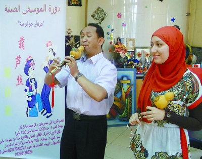 右图为:开罗中国文化中心在埃及迈阿迪图书馆“中国之角”举办葫芦丝短期培训班(资料图片)