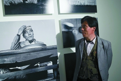 4月7日,“隐没地——上圈组村民与艺术家的影像实验”大型摄影展在北京今日美术馆开幕。展出的2600余幅作品出自80多位身份迥异的摄影家和29位宁夏村民之手。该展由中国摄影家协会携手新华社中国国际文化影像传播有限公司和今日美术馆共同举办。图为来自宁夏西吉县沙沟乡阳庄村上圈组的农民马文有在观看印有自己形象的照片。新华社记者 刘 杰 摄