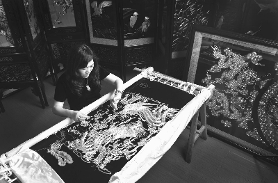 近年来,潮绣作为特色旅游纪念品重新受到青睐,迎来了新的发展机遇。祝书琴是广东省工艺美术研究所潮州市抽纱刺绣研究所所长,受外婆、母亲影响,自幼痴迷潮绣,是个地道的“潮州绣娘”。祝书琴决心抓住良机,让潮绣重新焕发新活力。她首先将绘画技巧引入潮绣,让潮绣更符合现代人的审美;其次通过各种宣传形式让大众更加了解潮绣。她还决定成立一个潮绣文化展览馆,并将此作为未来几年的事业重点。对于古老潮绣的复兴,祝书琴充满信心。图为祝书琴在制作潮绣。