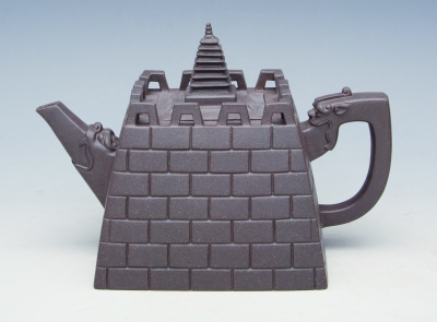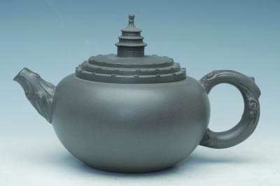 梅兰竹菊四君子以其卓然不群的形象入诗入画,象征知识分子处事傲然而不混同于流俗。王锡军的《高风亮节》壶也依此创生,全壶由16根竹节的外观组成,挺拔高古,腰间缠绕两根细竹,清新雅致,别有生机。竹子虚心,岁寒犹绿,直而不屈,有儒者高风亮节的风范。用作品来表达思想,既是个人创作理念的表达,也是对儒家审美标准的反馈。中国传统文化“独尊儒术”,纵使对法家的评价莫衷一是,法家的进取精神还是在中国文化里留下了深刻的一笔。《一柱擎天》壶形如其名,取《合欢》之壶身,壶盖有玉柱凌云之势,写意的曲把如挥毫泼墨的纵情一笔,全壶表现出一种男子汉顶天立地的气魄、擎天柱的形象。这把壶风格激越,能给人积极向上的力量。正因法家是男性话语的极致表述,在紫砂壶的创作中,男性会更容易受到法家的影响,在壶中注入豪迈、精进、激越的气概。