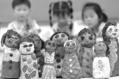 5月24日,山东省沂源县悦庄镇中心幼儿园开展“自制低碳教玩具迎六一”活动,小朋友在老师的指导下,利用秸秆、泥巴、树枝、毛线和布头等材料,制作各种低碳环保的玩教具,迎接六一儿童节的到来。图为小朋友展示用泥巴制作的玩偶。新华社发(赵东山 摄)