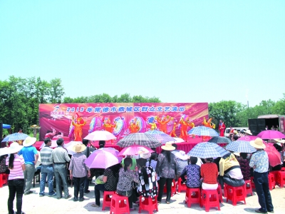 5月22日,常德市鼎城区草坪镇迎来了“赶集日”,村民们挑担携篮在集上买卖日常物品,吆喝声、讨价还价声不绝于耳。在离集市不远的镇文化广场上,2013年常德市鼎城区“百团大赛”草坪复赛正在举行。尽管阳光炙热,但10支农民剧团极具地方特色的表演吸引了众多赶集的百姓。