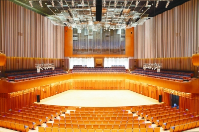 建筑物的核心是观众厅——交响乐演奏大厅,扇形平面是音乐厅常用平面之一。演奏台宽约25米,深约12米,面积210平方米,可供大型交响乐团演出。演奏台后设置300人的合唱队员席和管风琴,灯光设置考虑兼顾交响乐、合唱、独唱和民乐演出。观众席共有1038个坐席,其中池座500席,楼座538席。采用山谷梯田式格局,视野良好、向心感强,观众厅对外的疏散口均设置了声闸,以保证良好的隔音效果。中频混响时间拟达到1.8至2秒,声场均匀度拟达到±3分贝,根据声学要求设置扩散体及吸声设施,以达到良好的音质效果。