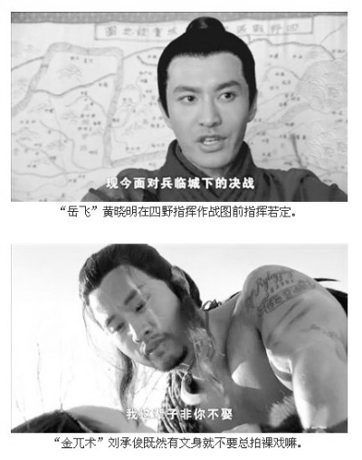 《精忠岳飞》中,英文穿越——金兀术肩头的英文文身,钱粮错误——5两银子买只鸡,军事乌龙——岳飞北伐地图惊现“四野战区”字样,激发了网友“找碴儿”的热情。
