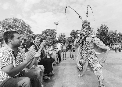 据了解,在为期一周的文化交流活动期间,首都艺术家们将在和田、喀什等地举行9场文化演出与书画交流活动。图为来自煤矿文工团的演员在表演“变脸”节目时与观众互动。