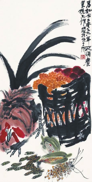 观吴悦石的画,常感胸中之气盈怀,几欲喷涌而出,这恰是审美体验共通的心理模式。其实观画者的胸中之气,概由画作所传达的情志所摄,而作为此种情志本体的创作者,如果胸中无气,那么作品便不能有所体现,笔墨自不会任情随兴。一幅名为《秋收》的画,画面中箩筐满盈稻谷,豆角玉米铺地,初看只以为是说农民丰收盛况,然观题字,才知作者之意:为记念二零零六年取消农业税而作。可以想到,此作落笔之初,缘于作者对现实心有所感,方有动笔之思。题字只为“记念”,并未有装腔作势的欢呼雀跃,可见作者作画之情志,不同于刻板摹画的惯常表达,有新意而无俗气。
