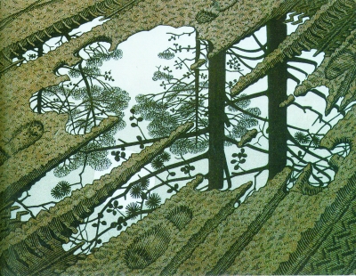 伟大的艺术家都看到了来自生活的启示录,他们试图阅读并理解其中深藏不露的意义。荷兰版画家埃舍尔在一次散步途中,突然被一幅意义深奥的场景震慑了。他停下脚步,身体发僵,很长时间呆立在那里。眼前的一片池水在微风中荡起涟漪,天空、池水四周的树木倒映在水面上,那样清晰、澄明、沉静。秋天的落叶漂浮在水面上,每一片叶子都拥有不同的色彩,它们初看起来好像有着相同的面容,实际上各自有着不同的齿边、叶脉以及尺度,这是它们用一生的力量打造出来的气质和个性。即使让人感到几乎完全一样的叶片的滴水尖,都会有一点微妙的差别。这些叶子来自不同的树木,甚至有着相似的经历,它们在水面上混合在一起,就像一群鸟儿从不同的地方赶来聚会,共进午餐。