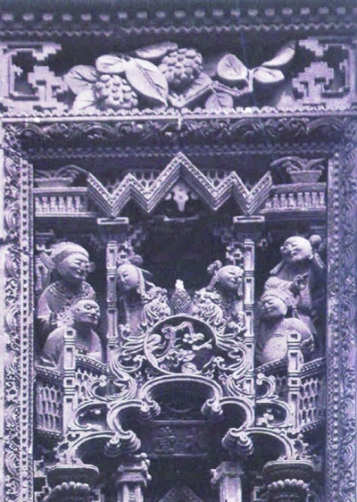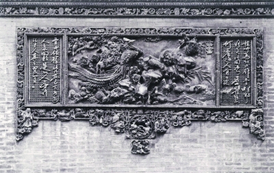 建成于1894年的广州陈氏书院(陈家祠)是广东现存规模最大、保存最完整的传统艺术建筑。它是广东陈姓宗族合资兴建的一座合族祠。这座建筑展现了大量民间工艺装饰作品,砖雕则是其几种建筑装饰的代表工艺之一,其装饰部位主要位于檐墙、廊门、山墙墀头等。这里既有排列整齐、雕工精细的砖雕斗拱,也有造型生动、刀法细腻的人物、鸟兽、瓜果、花木等图案。