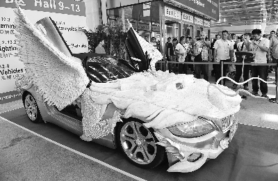10月15日,第114届广交会在广州琶洲会展中心开幕。图为客商在广交会展馆里参观骨雕艺术汽车“中国梦-飞龙”。该展品是19位雕刻工艺大师历时三年半雕刻而成,展示了中国传统雕刻技艺与现代工业文明的有机结合,吸引了众多客商的关注。