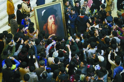 10月15日,“第十届中国艺术节2013欧美经典美术大展”在山东省博物馆开幕,包括莱昂纳多·达·芬奇《自画像》及西方多位艺术大师的354件经典作品与市民见面。据悉,莱昂纳多·达·芬奇的《自画像》是首次来华参展。图为用作揭幕仪式的《自画像》仿品被观众包围拍照留念。
