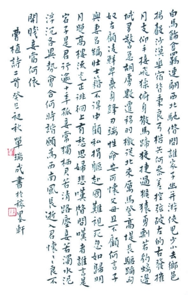 单瑞成平时落笔,一半是书艺格调,一半是情操修养,融合成他的作品。他又喜读古典文学、哲理篇章,这使他的作品多了厚实朴拙,在线条圆润、清秀灵动中,彰显清淡自然、稳健流畅。他把温厚和阳光放在书艺里,把才气和底蕴放在笔墨里,一起传递给人们。这已超越了书法的格局和气势,业内外许多人士认可了他的多重价值。