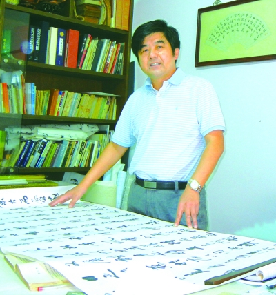 秋高气爽,丹桂飘香,置身于闲适宁静之东台让人觉得心旷神怡。循着一阵书卷笔墨之气拾级而上,步入单瑞成的稼墨轩,映入眼帘的是一个广阔的艺术天地。硕大的书案上方,悬挂着书法大家孙晓云和言恭达的行书,依傍着名家墨迹,一侧墙壁上,系挂着瑞成5000字的蝇头小楷《金刚经》,作品虽属小楷,却写得雍容和雅,有大字格局,字里行间,笔势精妙,点画俊逸,行笔自然,显得娟秀精美,典雅而富有韵味,为稼墨轩增添了许多古典禅意。朝南几扇大窗,迎接着正午的阳光,临窗一盆君子兰,流淌着点点滴滴的春意,映衬着屋里的书香之气。20多年来,他就在这间书屋里,夜以继日泼墨挥毫,笔耕不辍,在中国书法的迢迢远路上,跟随着大师,寻找符号,锤炼技巧,一步一步向自由王国迈进。