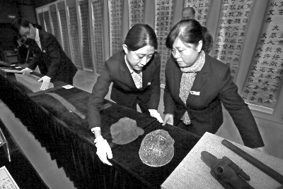 10月24日,数名台湾同胞向中国人民抗日战争纪念馆捐赠了30余件珍贵的抗日文物。这些文物大都由我国台湾抗日志士后代以及台湾抗日史研究专家、文物收藏家捐赠。图为工作人员在布置展品。本报记者 喻非卿 摄