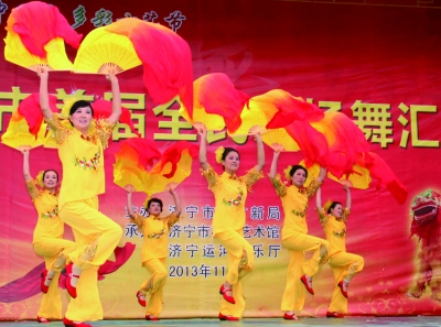 11月8日,以“美丽中国梦 多彩十艺节”为主题的济宁市首届全民广场舞汇演在济宁市文化广场上演,来自济宁市13个县区的16支演出队伍参与汇演决赛,参赛者以中老年人为主,最大的已75岁。图为兖州市圣花集团海燕舞蹈队表演的长扇舞《祖国你好》。庞 雷 摄影报道