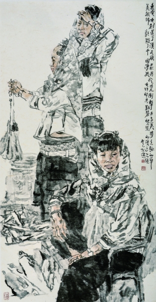 郭东健既继承传统文脉,又以探索的姿态来关注现实、人生、社会。长期生活工作于福建的郭东健,对具有特殊民族文化风情的惠安女子也是情有独钟,惠安女的黄斗笠、蓝衣服、黑裤子、花头巾、银腰饰等特殊的服饰和美丽令他怦然心动。因为当地男人大多外出谋生,惠安女肩负着家庭农活、养老抚幼的重担,在特殊环境中造就出了吃苦耐劳、坚韧不拔的精神,造就出了企盼爱情、忠于爱情的情怀。郭东健从她们身上发现了人性之善和传统之美,经常用画笔来抒发对惠安女的敬佩与赞美之情。