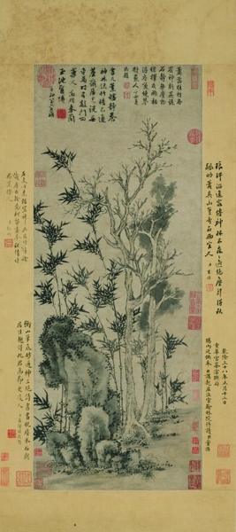 展出作品有一幅《双柯竹石图》,以枯木竹石为题材。自北宋苏东坡以来,文人画家喜写枯木竹石,以寄托逸兴。此图画霜柯两株、叠石一拳、翠竹数竿。画法主要以枯笔勾皴,淡墨渲染,浓墨写叶、点苔。运笔朴厚,墨法清润,甚有清逸洒脱之气。自题:“书几熏炉静养神,林深竹暗不通尘。斋居见说无车马,时有敲门问药人。徵明奉简玉池医博。辛卯闰六月朔。”钤:“文徵明印”白文印、“徵仲”朱文印、“玉兰堂印”朱文印。画幅上另有乾隆次韵诗题,乾隆曾将之赐予董诰,裱边有纪昀、朱珪、岳钟琪诗跋及董诰题记。